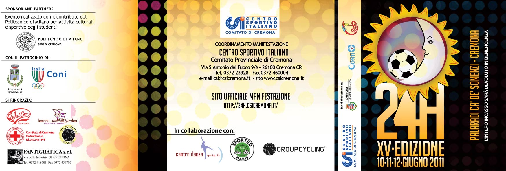 Il CSI di Cremona, il Comune di Cremona, l'Associazione Giorgio Conti e l'Associazione Credo organizzano la Quindicesima Edizione della 24H presso il PALARADI a Ca' de' Somenzi a Cremona.